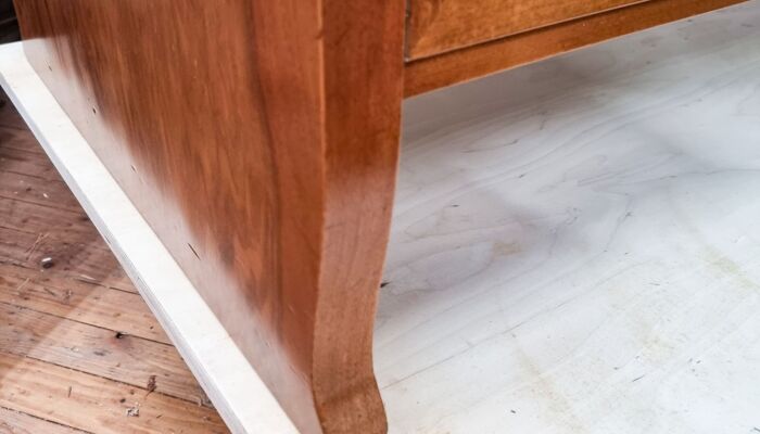 Ausführung: Neulackierung der zerkratzten und verblichenen Oberfläche und Reparatur der beschädigten Furniere