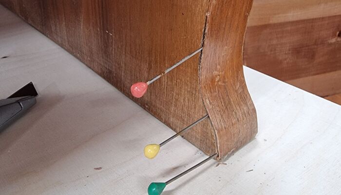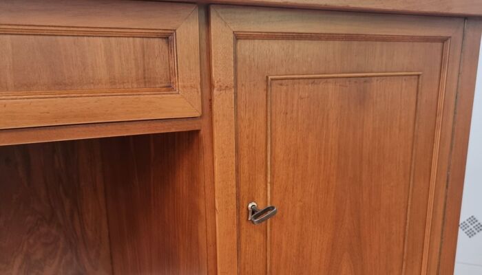 Ausführung: Festleimen erheblicher Furnierablösungen, kompletten Korpus neu verleimt, originale Möbelschlösser repariert und neue Schlüssel gefertigt, erneuern der abgängigen Lackoberfläche, Ledereinlage auf der Schreibplatte erneuert
