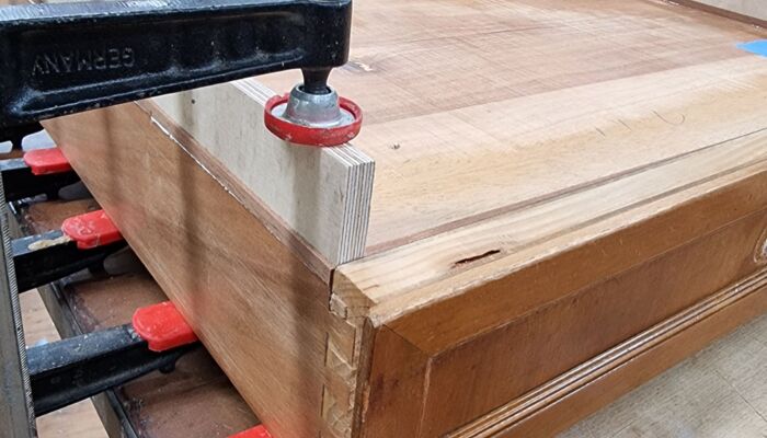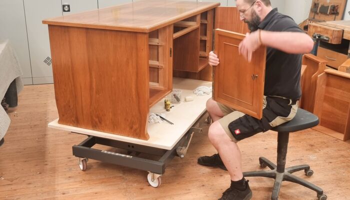 Ausführung: Komplette Restaurierung, Instandsetzung der Kulissenführung, Reparatur der Hölzer und Furniere, Wiederherstellung der Lackoberfläche mit Schellack